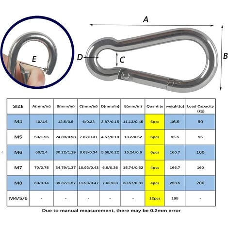 M5 mousqueton, longueur: 1,96″/50mm, épaisseur: 0,18″/4.57mm, diamètre du diamètre d’ouverture du mousqueton: 0,52 « /13.2mm, 6 pieces poids du mousqueton: 95,5 g