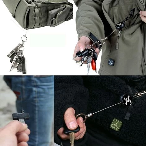 La longueur maximale du fil de traction est d’environ 60 cm de contraction.La boucle à clé permet de sécuriser facilement le sac à dos, les passants de ceinture, le portefeuille, etc.
