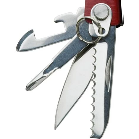 Les mini-outils supplémentaires inclus sur cet appareil comprennent un couteau à bord droit, un couteau dentelé, un Lampe de poche LED et un porte-clés pour un transport facile