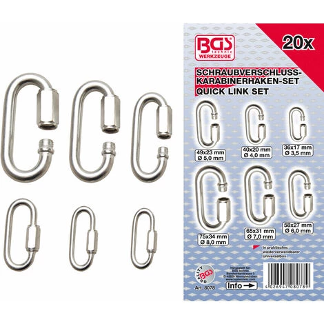 6 mousquetons Ă visser 36 x 17 mm, Ă 3,5 mm4 mousquetons Ă visser 40 x 20 mm, Ă 4,0 mm4 mousquetons Ă visser 49 x 23 mm, Ă 5,0 mm2 mousquetons Ă visser 58 x 27 mm, Ă 6,0 mm2 mousquetons Ă visser 65 x 31 mm, Ă 7,0 mm2 mousquetons Ă visser 75 x 34 mm, Ă 8,0 mm