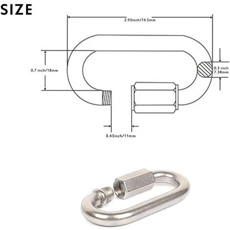 DIMENSION – Longueur: 74 mm; Largeur: 18 mm; Diamètre: 7,83 mm; Poids: 0,08 g; Tenir le poids: 500 kg.AVERTISSEMENT: NON applicable pour l’escalade.