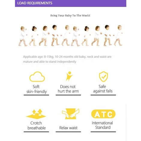 - Conception entièrement réglable: Les ceintures de sécurité de la marchette portative pour bébé et les boucles de haute qualité peuvent être ajustées à lTaille du sein en fonction de l’épaule du bébé, ce qui permet au bébé de se sentir à l’aise