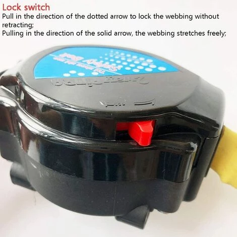 Interrupteur de verrouillage – Tirez dans le sens de la flèche pointillée pour verrouiller la sangle sans rétracter; tirez dans le sens de la flèche pleine pour élargir et contracter librement la sangle.