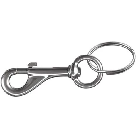 Utilisation : Mousqueton pour porte-clés et autres produits similaires. Système sur ressort pour ouvrir et fermer rapidement. Avec anneau pour porte-clés. Matériau : Zinc moulé sous pression, nickelé.