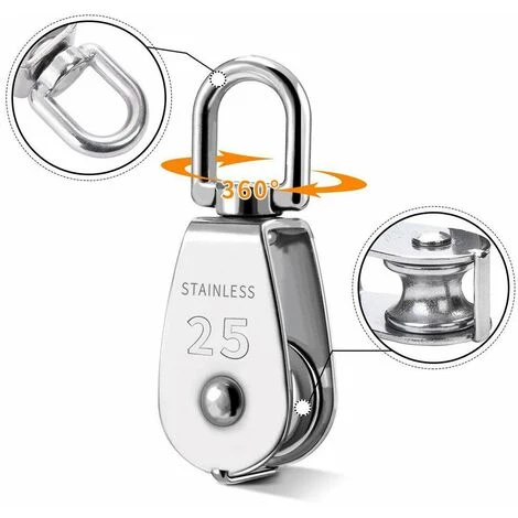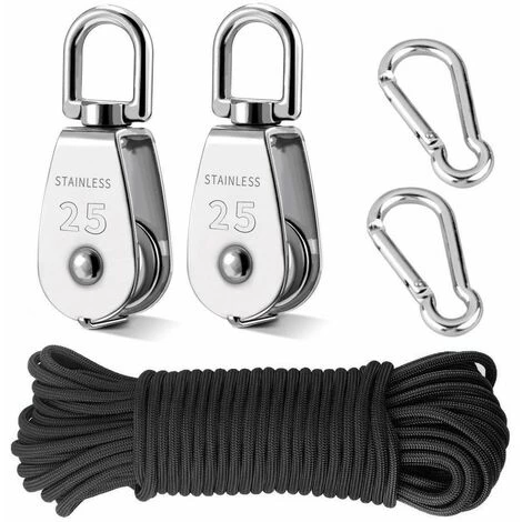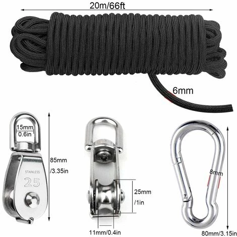 Contenu de l’emballage: M25 Poulie Simple ×2 , M8 Attaches à crochet mousqueton ×2 , 6MM Corde de poulie en nylon de 20M. Limite de chargement simple 160 kg / 330 LB.