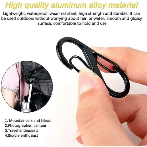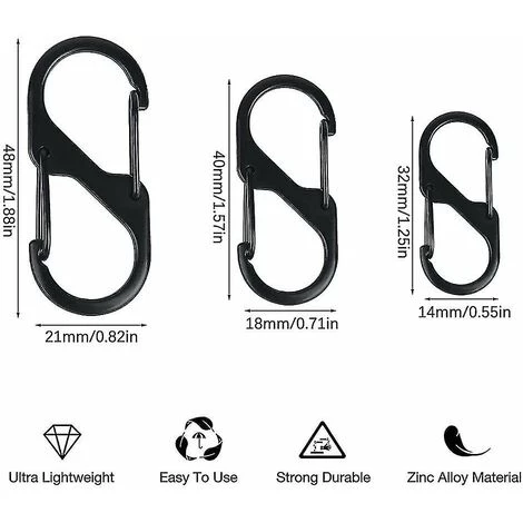 [Ultraleicht und kompakt]: Der S-förmige Karabiner besteht aus einer hochwertigen Zinklegierung. Leicht, wasserdicht, verschleißfest, hochfest und langlebig. Die Oberfläche ist glatt und glänzend, und es ist angenehm zu halten und zu verwenden. Sehr gut geeignet für kleine Rucksäcke, Schlüssel etc. [Doppelte Öffnung]: Jeder stabile Ansteck-Schlüsselanhänger hat 2 Türöffnungen, sodass Sie Wertsachen wie Schlüssel auf einer Seite befestigen können, dann die andere Seite am Rucksack befestigen. Die Schnallenfeder ist gut, nicht leicht zu lösen, nicht leicht zu brechen, gute Verarbeitung und verblasst nicht. [Einfach zu bedienen]: Aufgrund seiner geringen Größe und Tragbarkeit kann der Benutzer die beiden Öffnungsschnallen mit einer Hand bedienen, ohne zu viel Energie und Zeit aufzuwenden. [Breites Anwendungsgebiet]: Es wurde speziell für verschiedene Schnellverschlüsse wie Camping, Reisen, Schlüsselanhänger, Rucksäcke usw. entwickelt. Es eignet sich zum Aufhängen kleiner und leichter Gegenstände beim Reisen mitten in der Luft, beim Camping, Angeln und wandern. & nbsp; 30 Stück S-Karabiner. 10 * S großer Karabiner, 10 * S mittlerer Karabiner, 10 * S kleiner Karabiner. Feature: -Hergestellt aus hochwertigen Materialien, langlebig und leicht. Große Tragfähigkeit, geringes Gewicht, kein Rost, stark und praktisch, keine scharfen Kanten oder geschreddert. -Der S-förmige Schlüsselbundhaken ist ein praktisches Werkzeug, um Ihren Freunden und Ihrer Familie zu helfen, Outdoor-Aktivitäten (wie Camping, Angeln, Campingreisen, Wandern, Radfahren und Klettern) zu genießen. -S Der Karabiner lässt sich einfach und bequem an Rucksäcken, Schlüsselanhängern, Gürtelschlaufen etc. befestigen. Er ist leicht und einfach zu transportieren. Spezifikation: Material: Zinklegierung. Farbe schwarz. Menge: 30 Stück Größe: Großformat: ca. 48 mm x 21 mm. Mittel: ca. 40 mm x 18 mm. Klein: ca. 32 mm x 14 mm. Lieferumfang: 10 x S-Karabiner (groß). 10 x S-förmiger Karabiner (mittlere Größe). 10 x S-Karabiner (klein).