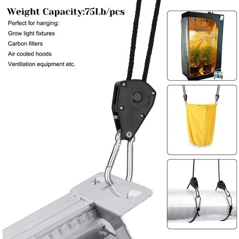 – Lot de 2 cliquets d’une capacité de charge de 150 livres, cintres en corde réglables de 1/8 pouce pour suspendre des lampes de culture, des luminaires hauts, des sacs à guirlandes et du matériel de ventilation.