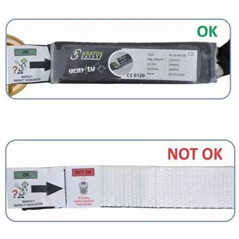 – Étiquette d’indicateur de chute : Avant chaque utilisation, vérifiez votre longe à absorbeur d’énergie. Si le cadre « NOT OK » est visible sur l’étiquette, cela signifie que votre équipement a arrêté une chute et ne doit donc pas être réutilisé. Veuillez le remplacer par un équipement conforme