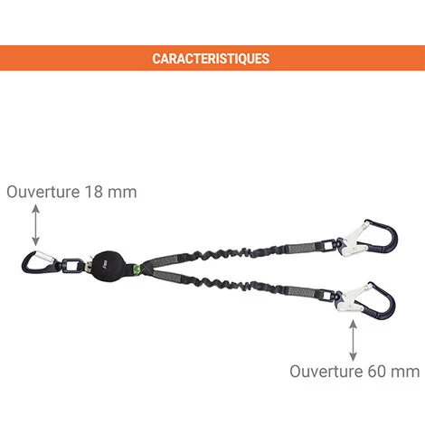 – Absorbeur d’énergie en sangle à déchirure, largeur 45 mm afin d’avoir un impact inférieur à 6 kN en cas de chute
