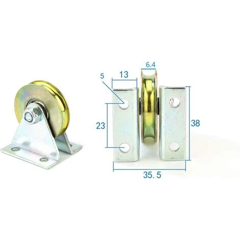 Charge utile : 100 kg. Diamètre : 38 mm – Largeur de la rainure : 6,4 mm – Longueur du support : 38 mm – Diamètre du trou du support : 5 mm – Hauteur du support : 34 mm – Rainure : U