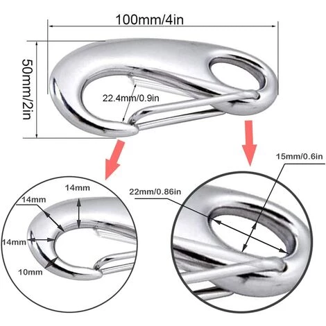 Ces clips en acier inoxydable de qualité marine sont très scientifiques et ont un trou séparé, sous le clip, ce qui est bénéfique pour protéger la corde contre les dommages et ne desserre pas la corde en raison de l’ouverture ou de la fermeture de la porte à ressort. Les yeux sont assez grands et lisses pour faire glisser une corde solide, facile à accrocher et à décrocher.