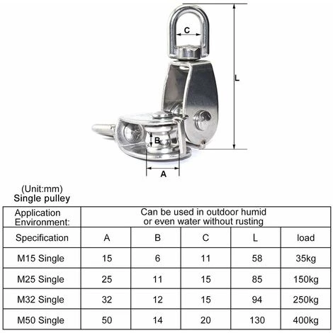 Caractéristiques: Matériau: acier inoxydable 304 Taille: Roue en acier inoxydable (P x L): 0,98 » / 25mm x 0.43 » / 11mm; Diamètre de l’oeil: 15mm Hauteur totale: 85mm / 3.35 « ; Capacité de charge maximale: 331lbs (150kg), Poulie coulissante flexible à forte capacité de charge. Produits inclus: 2 x poulie simple M25