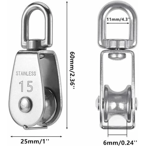 Poulie simple M15 – Bien construite en acier inoxydable 304, elle est pratique pour la vie et le travailConception de rotation de 360 degrésÉvitez de nouer la corde / le câble / le câble, ce qui est facile à installer et à utiliser, facilite votre travail.Roue lisseNotre produit est antirouille et résistant à la corrosion avec une douceur lisse. Doté d’une capacité robuste avec un design très pratique et une structure ultra solide.Poulie en acier inoxydable 304 pour intérieurs et extérieursConçu pour une utilisation avec cordon / câble / fil pour des applications intérieures et extérieures. Convient pour les grands kayaks, canoës, usines, constructions, expéditions, mines, maisons. Parfait pour les garages, chargement de machine, tente, corde à linge, système de nettoyage de chien, etc.Spécifications:Matériau: acier inoxydable 304Roue en acier inoxydable: 60 mm x 25 mm x 6 mm (longueur x largeur x épaisseur)Diamètre des yeux: 11mmHauteur: 60mmCapacité de poids: 35kg(S’il vous plaît voir la quatrième image)Le forfait comprend:4pcs x Serrure de poulie simple M15