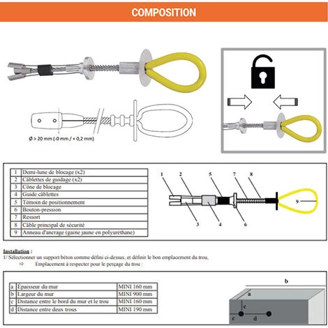 – Conçu pour être installé dans du béton très rapidement grâce à un bouton de pression qui coince le point d’ancrage dans la structure