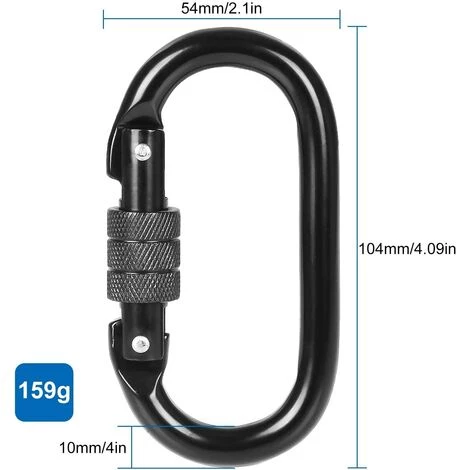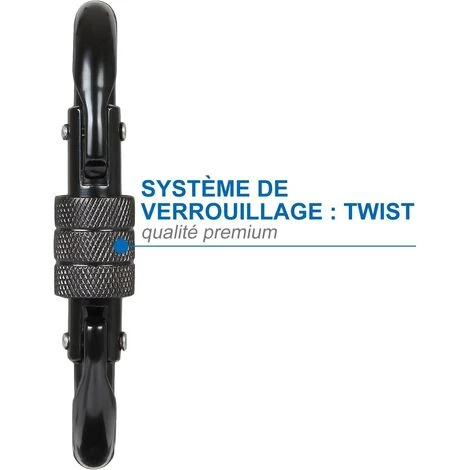 Le mousqueton étant en position normale d’utilisation, on tourne la vis dans le sens horaire des aiguilles d’une montre, de façon à rapprocher cette vis du rivet à la base du bras de fermeture. OUVERTURE MAX.: 20 mm DURÉE DE VIE MAX.: 10 Years Résistance: 20kN TAILLE: 110 x 61 mm Diamètre: 10 mm POIDS: 159g SYSTÈME DE VERROUILLAGE: Twist MATÉRIAU: Aicer