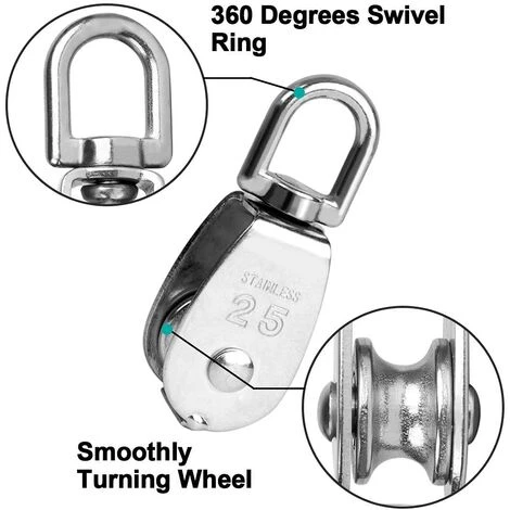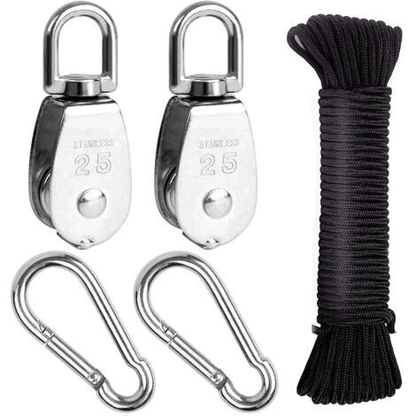 « Combinaison pratique : 2 poulies de 25 mm, 20 mètres / poulie en nylon de 4 mm, 2 mousquetons en acier inoxydable de 6 mm. Poulie simple M25 charge maximale : 150 kg, corde en nylon, capacité de charge maximale : 150 kg, mousqueton à ressort, charge maximale : 150 kg.Haute qualité : La bobine et le mousqueton sont en acier inoxydable 304 inoxydable et résistant à l’usure. Ils ont un aspect brillant et une structure solide, et sont spécialement conçus pour suspendre des objets lourds.Large application : peut être utilisé pour les cordes intérieures et extérieures, les sacs à dos, les porte-clés, les chaînes, le camping, la pêche, les animaux domestiques, les accessoires de bricolage, le fitness, le vélo suspendu, l’alpinisme et le fitness intérieur-extérieur, le garage, le chargement de la machine, le rideau, la corde à linge, le chien. système de poulies, etc.Conception ergonomique : L’anneau de levage peut pivoter à 360 ° pour éviter que le câble métallique ne s’emmêle.Couleur : argentPoids : 1 kg »