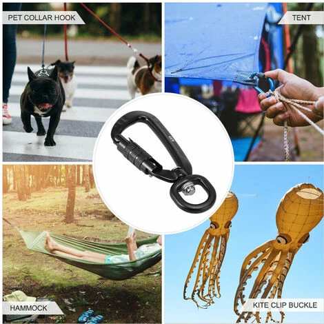 Mousqueton à verrouillage automatique et anneau relié à un axe en métal, lisse et sans frottement, rotation à 306 ° pour empêcher la torsion de la corde du hamac ou de la laisse de l’animal.