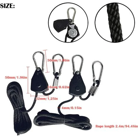 Compatible: Il est compatible avec un support fiable et des jeux corrects du système et des mécanismes de serrage, à condition que les crochets et les boulons à œil s’adaptent. Avec un fermoir en métal pour attacher la corde à une extrémité, ces nouveaux cintres permettent de soulever et d’abaisser les lumières et autres choses facilement et en douceur. Découvrez votre tente suspendue, votre ventilateur et plus encore.
