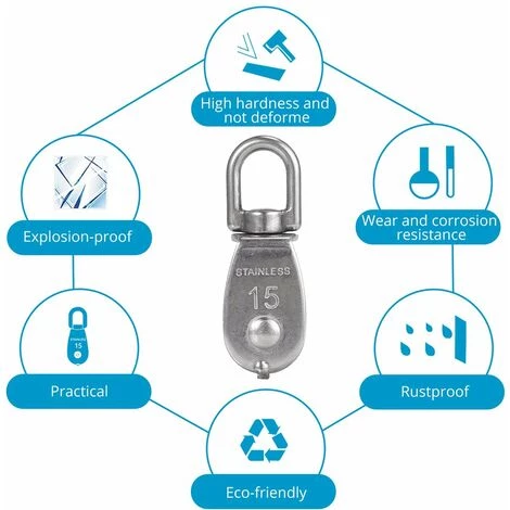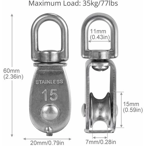 【Capacité de Charge】Roue en acier inoxydable: 0,59 « / 15 mm x 0,28 » / 7 mm (P x L), diamètre des yeux: 11 mm / 0,43 « , hauteur totale: 60 mm / 2,36 ». Capacité de chargement maximale: 77 lb (35 kg). Poulie coulissante flexible à forte capacité de charge.