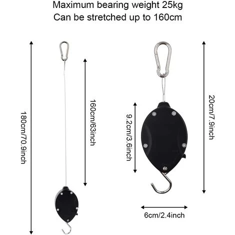 Matériel: corde et crochet en acier inoxydable Taille naturelle: 20 * 6cm Taille d’étirement: 180 * 6cm, la corde peut être étirée 160cm Couleur noire Quantité: 2 pièces Capacité de charge: 25kg