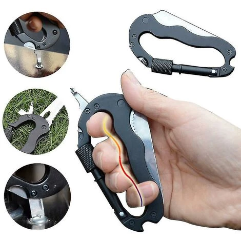 Nom: Couteau de survie multifonctionnel de type mousqueton cinq en un pour l’extérieurCouleur: NoirTaille: environ 10,5 * 5,5 cm Fonction: Il peut être utilisé comme crochet rapide ou comme tournevis cruciforme / tournevis à fente / scie à couteau. Mode, pratique, petit et exquis, adapté à la maison et à l’extérieur