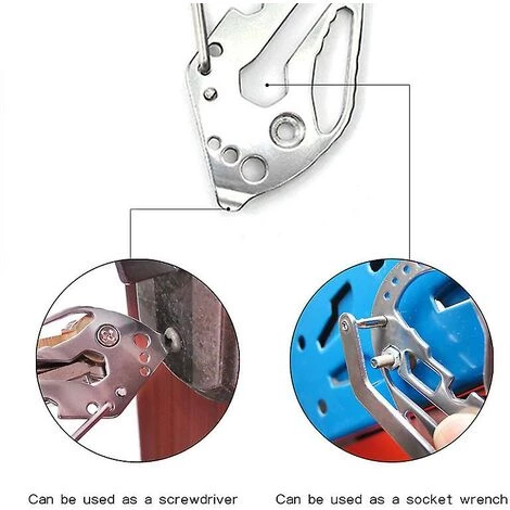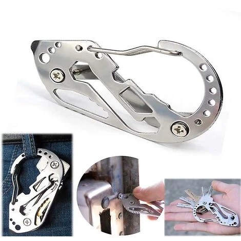 Caractéristiques : Fonction : tournevis à fente, clé, mousqueton à bouton d’escalade, porte-clés, boussole à arc. Ouvre-bouteille. Acier inoxydable artensitique : résistance à l’abrasion, durable, solide et stable. Taille compacte, facile à transporter, la conception intelligente peut faciliter votre exploration en plein air. Matériau : acier inoxydable martensitique Couleur : argent Taille : 8,8 x 5 cm Le forfait comprend : 1 x porte-clés